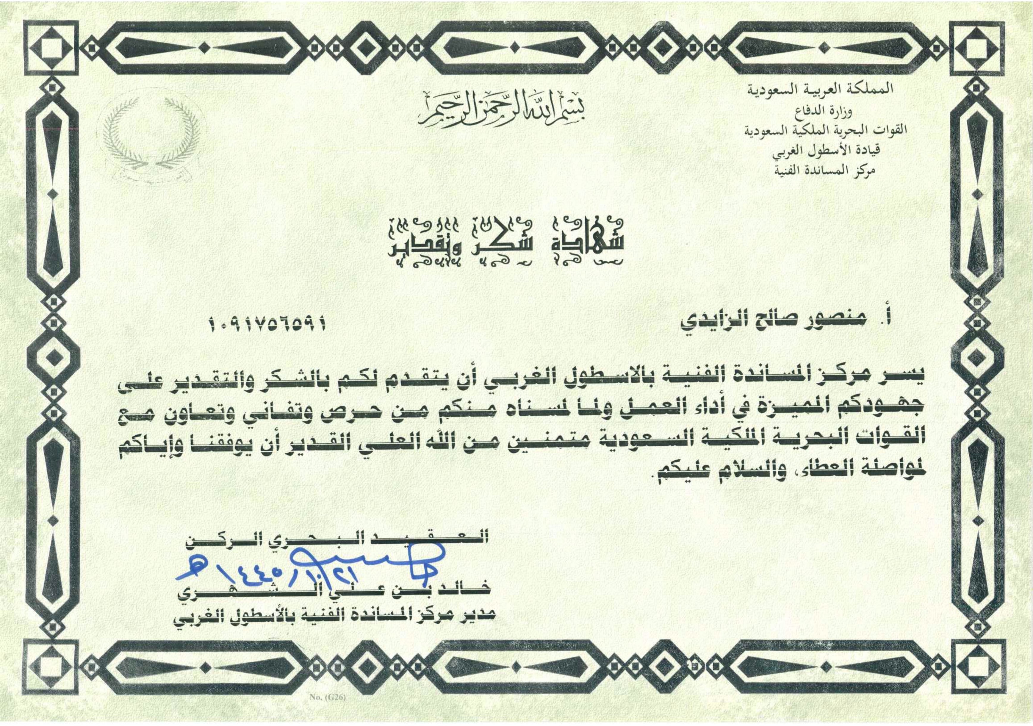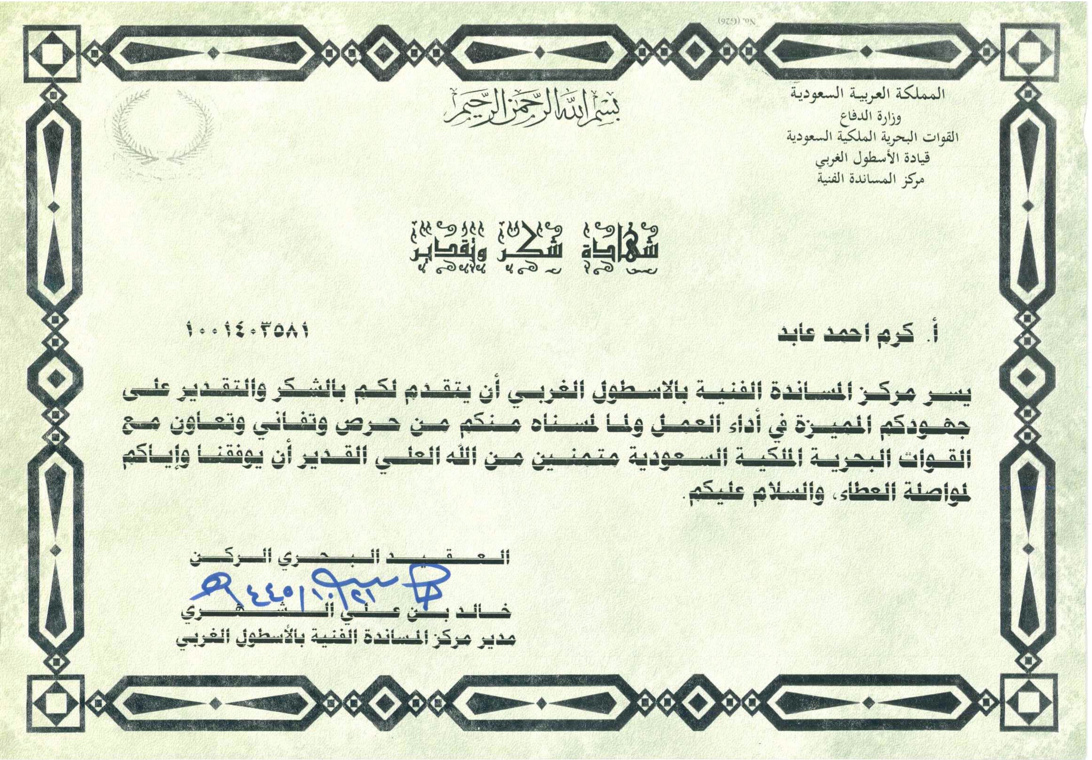 In return of our continuous efforts and hardwork, our E.V.P. Mr. Karam A. Abed and legal advisor Mr. Mansour Saleh Al Zaidi have received Certificates of Appreciation from the Ministry of Naval Forces of Saudi Arabia on 30th April 2024.