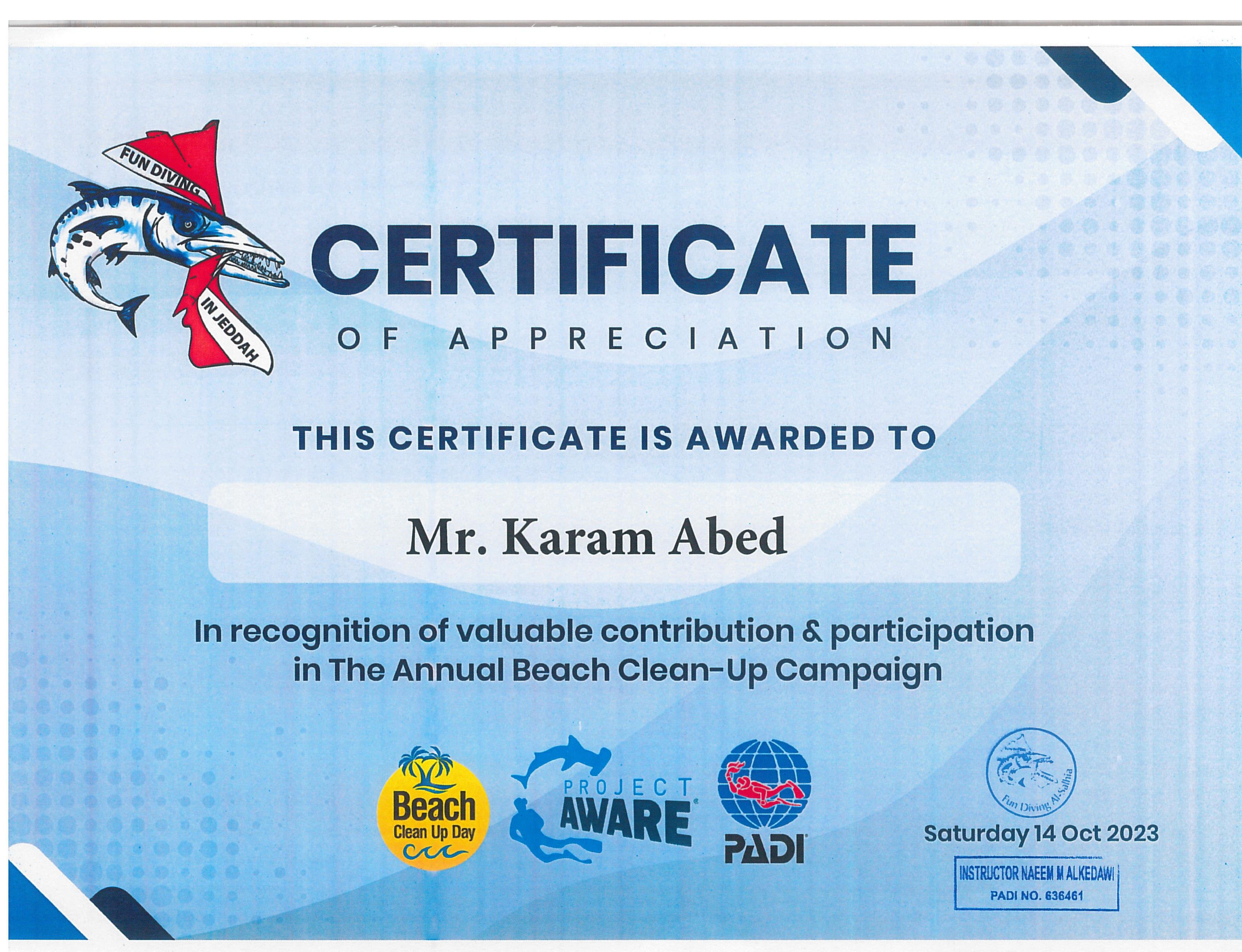 A certificate of appreciation was awarded to the Executive Vice President of PMDC, Mr. Karam A Abed in recognition of valuable contribution & participation in the Annual Beach Cleanup Campaign helf at Salhia Private Compound.